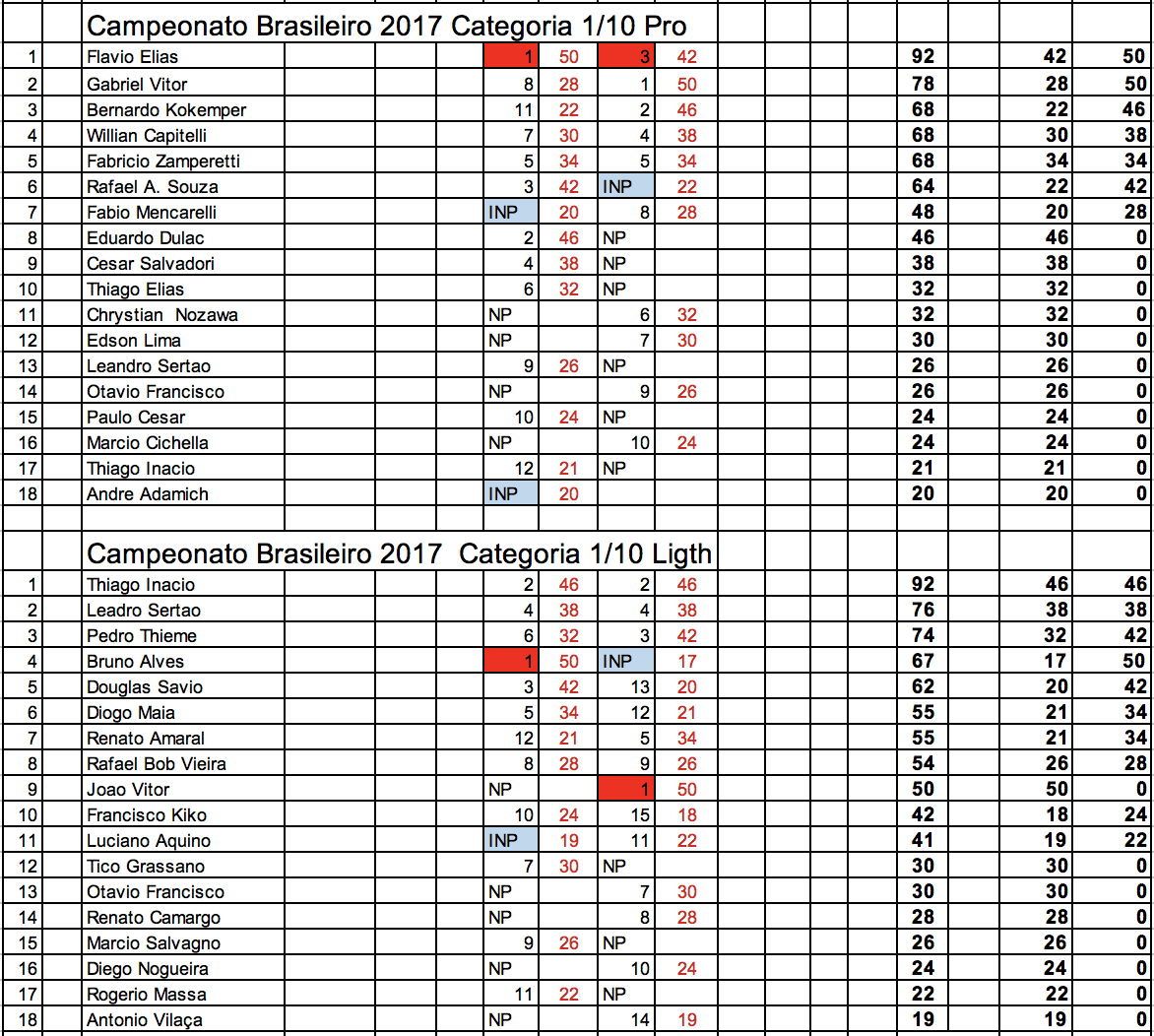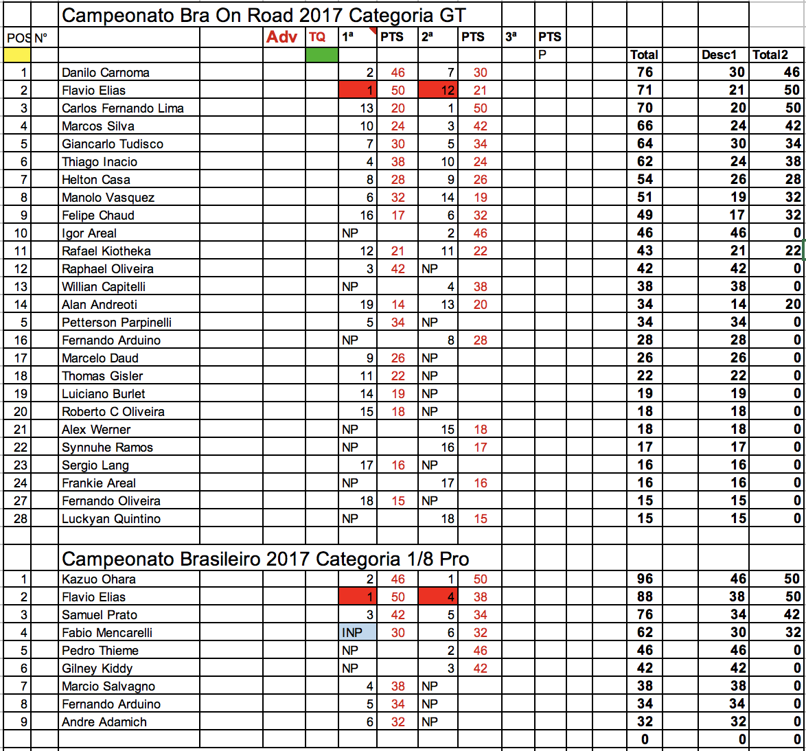 Categorias este ano serão 3 etapas, 1/8 Pro, 1/8 GT, 1/10 Pro e 1/10 Ligth. Pontuação computada ate a 2ª Etapa, e não esta considerado o descarte.A 3ª e Ultima prova sera realizada nos dias 14 e 15 de Outubro de 2017 na pista de Americana Zeca Elias.